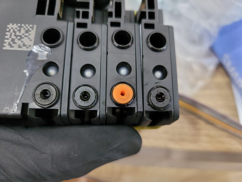 카트리지를 빼니 마젠타 블랙만의 문제가 아닌 시안의 부싱 고무가 노후화되어 빠져 있었습니다.