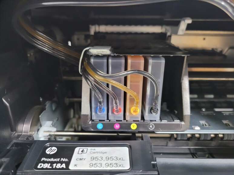 위와 같은 메세지는 8710 무한잉크를 온라인으로 구매하신 분들에서 많이 나타납니다. 카트리지를 빼보면 중국산 4칩으로 되어 있습니다. 온라인 판매제품은 낮은 가격으로 노출하기 위해 저렴한 시스템을 사용한 경우 자주 나타납니다. 카트리지 소모됨으로 초기화 작업을 하면 사용량이 별로 없어도 잦은 펌핑으로 스테이션에 잉크가 넘쳐 흐르기도 합니다. 자동 펌업데이트로 칩을 새로 교체해야 하는 경우도 자주 발생합니다.