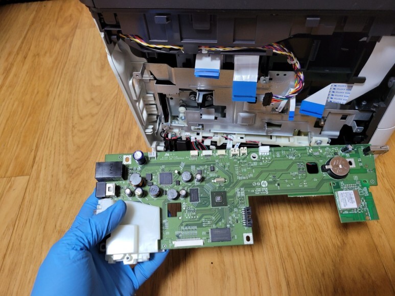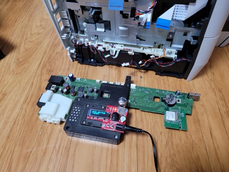 No Chip 무한잉크를 위해 좌측 커버를 열고 메인보드를 빼서 No CHip 펌 지그에 물렸습니다.