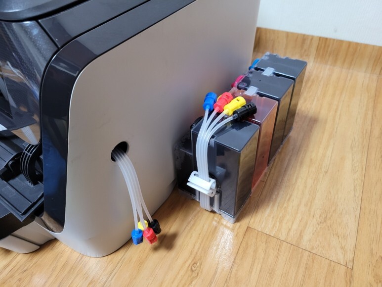 카트리지를 모두 제거하고 하우징 오른쪽을 타공하여 무한잉크 공급선을 외부로 뺐습니다.