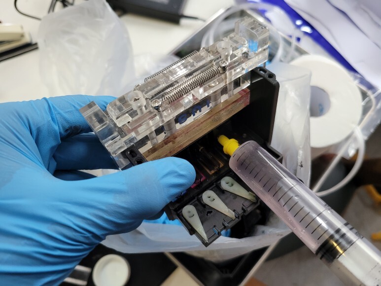 탄성접착제 양생 및 테이핑 보강, 지그 보호 등을 한 후에 강 세정액을 주입하여 헤드 노즐을 세척했습니다.