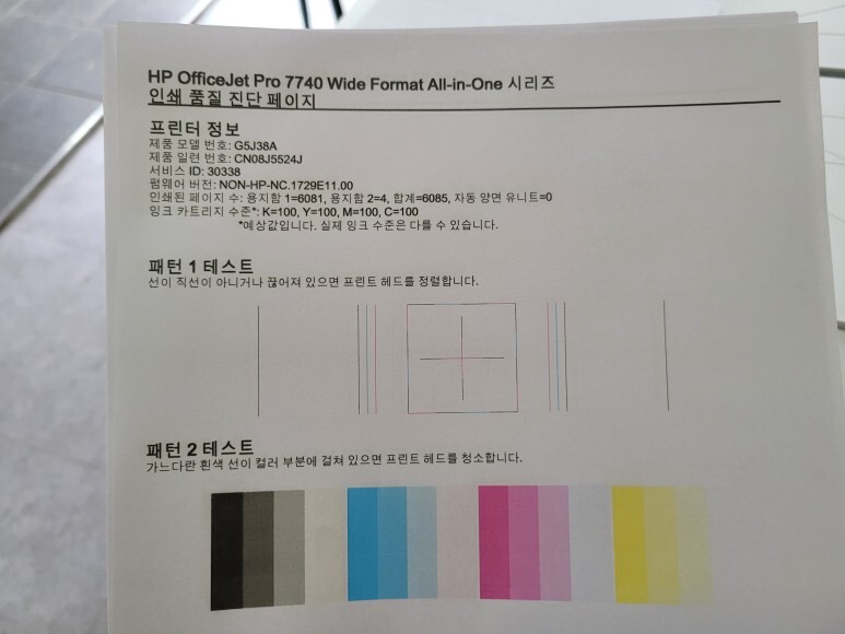 블랙 색상이 전혀 출력이 안 되고, 마젠타 색상도 노즐에 약간 문제가 있었습니다.