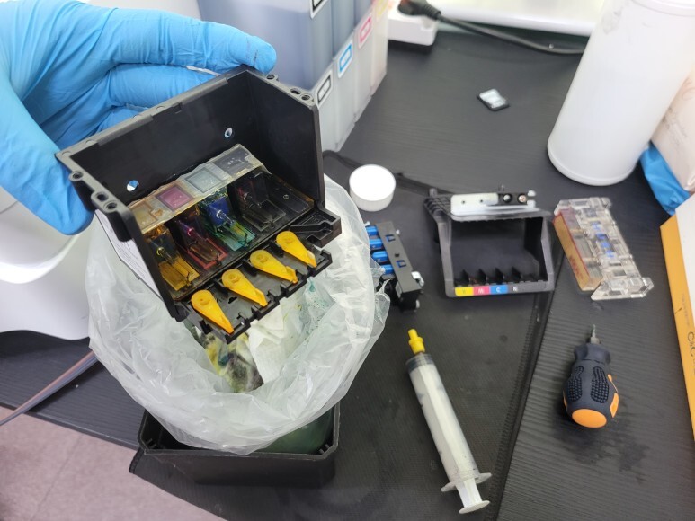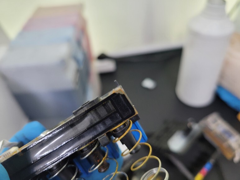 3) 미세한 노즐 막힘은 헤드 챔버 부분을 터지게 합니다. 사람도 뇌혈관이 막히면 터져 사망에 이르게 됩니다. 헤드도 노즐이 막히면 헤드가 터져 잉크가 흐르고 교체해야 하는 비용을 지불하거나 폐기해야 합니다. (중환자수술 또는 뇌출혈사망)