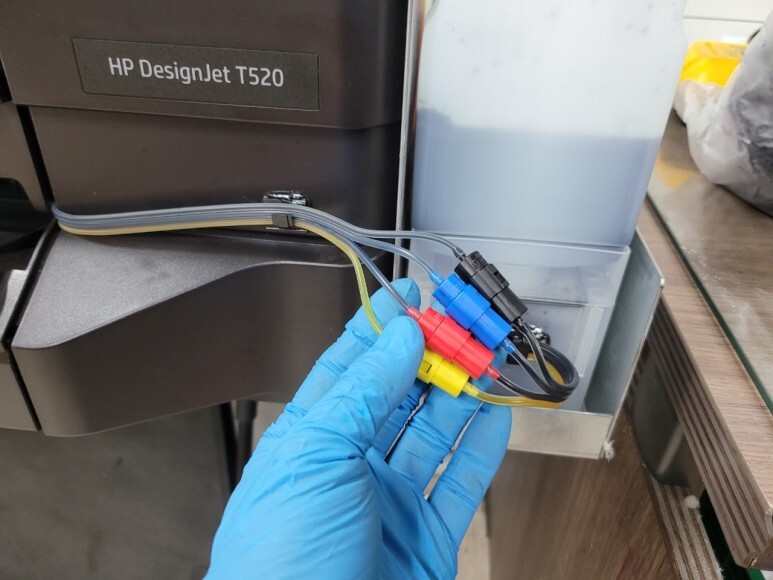 경기도 용인시 수지구 죽전동 소재 업체에서 사용하는 플로터인 HP 디자인젯 T520 24인치 무한잉크 플로터가 작동 불가하여 출장수리 요청하여 1) 호스 내부에 잉크가 빠짐 잉크 석션 및 HARD RESET 초기화 2) 신규 체인 및 브라켓 교체 3) 노후된 퀵차단밸브 교체 4) 4색 전체 카트리지 문제로 펌웨어 업그레이드 등등 수리 완료 했습니다.