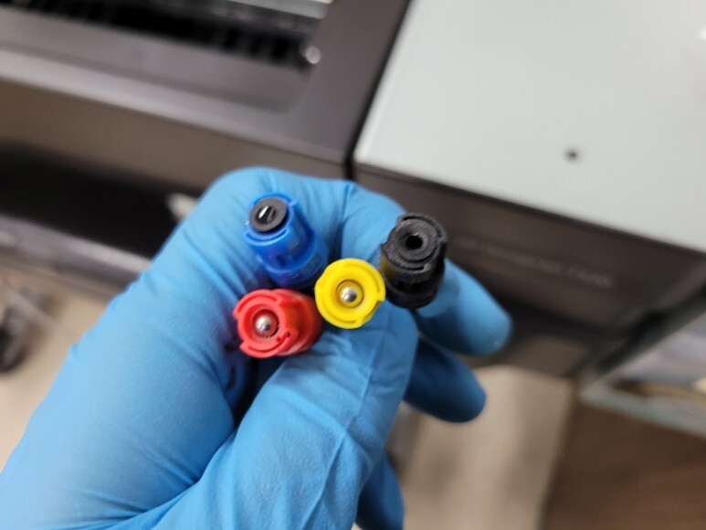 카트리지 잉크 석션하여 호스 및 카트리지 내부에 잉크를 가득 채웠습니다.