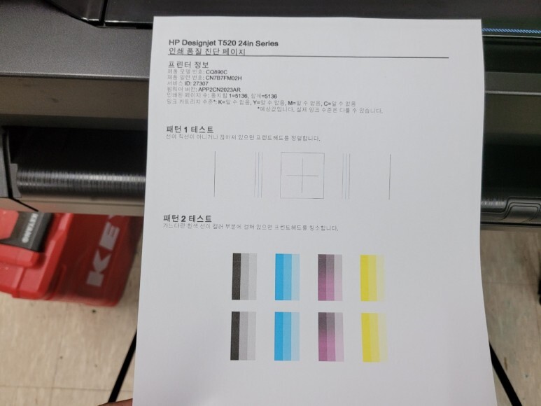 헤드 노즐 상태를 확인하기 위해 진단이미지인쇄/인쇄품질보고서를 출력해 확인했습니다.