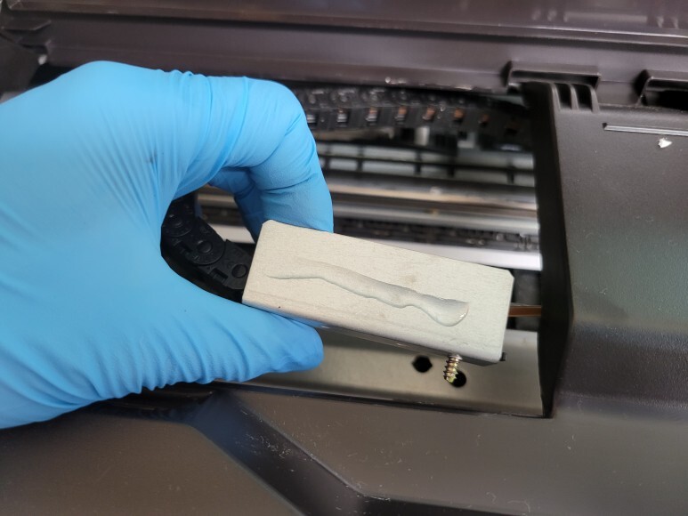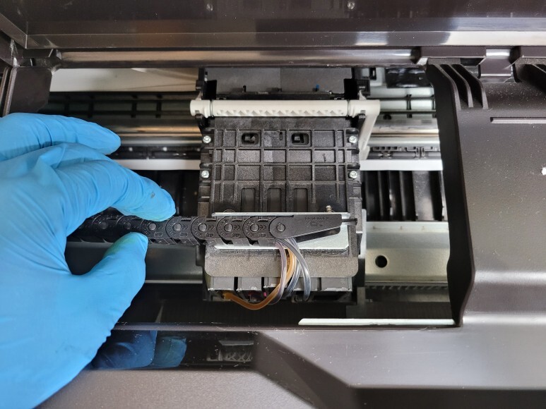 카트리지 잉크 석션하여 호스 및 카트리지 내부에 잉크를 가득 채우고 신규 헤드에 카트리지를 장착하였습니다.