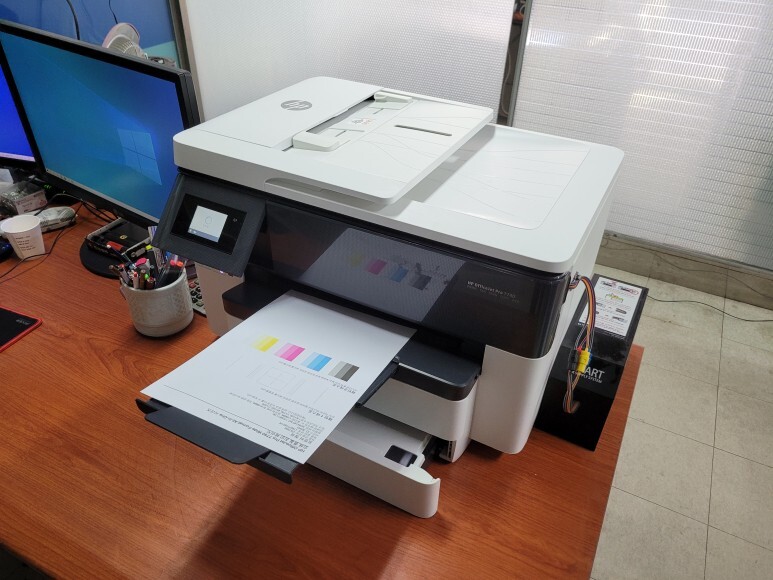 경기도 용인시 처인구 소재, 건설관련 회사 사무실에서 사용하는 사무용 프린터로 잦은 카트리지 문제 및 소모품 시스템 문제로 멈춰버린 유한 4칩 HP 7740 무한잉크 장비를 기업형, B2B용 (보험사, 군부대, 학교, 학원, 부동산, 핸드폰매장, 교육사 등등)으로 사용되는 칩없이 구동하는 기업형 No Chip 무한잉크 장비로 전환 출장수리 요청으로 스케줄 맞춰 방문하여 수리 완료 했습니다.