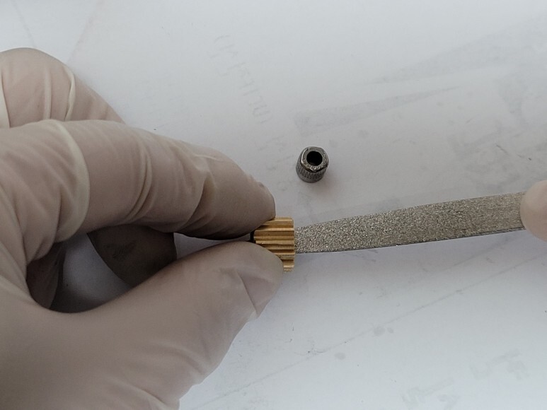 신주 재질의 기어에 스텐 베어링이 들어가도록 반원 줄질을 해야 하는데 꽤 많은 양을 줄질로 깍아 내야 합니다.