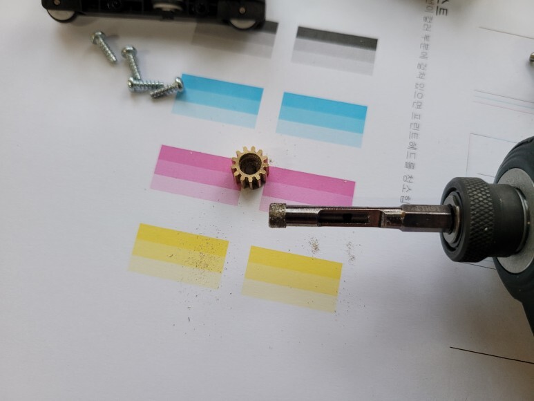 교체할 기어 내부를 스텐 베어링 심이 들어가게 깍아냈습니다.