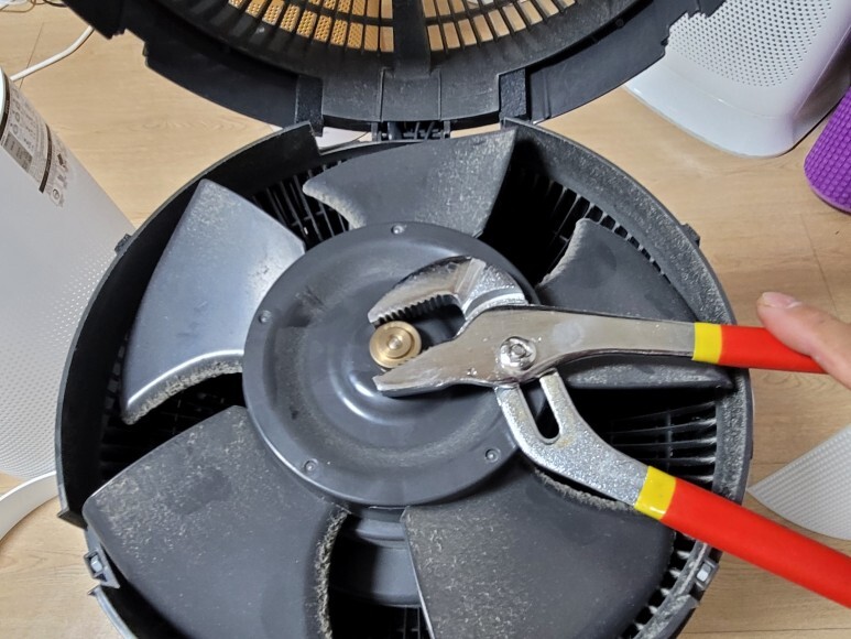 팬을 단단히 조여져 있는 나사를 공구를 이용해 살짝 풀어주고 손으로 돌리면 쉽게 팬을 분리해 물로 세척 합니다.