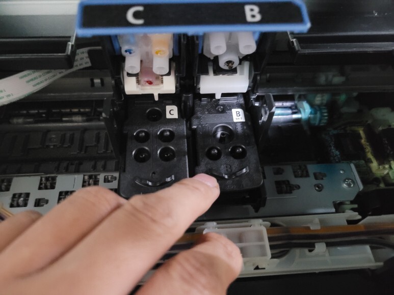 상부를 열고, 중지 버튼 5초간 2회 눌려 캐리지가 교체 위치에 이동, 잉크 공급선에 잉크가 빠지지 않게 잉크 탱크 커버를 먼저 올렸습니다.