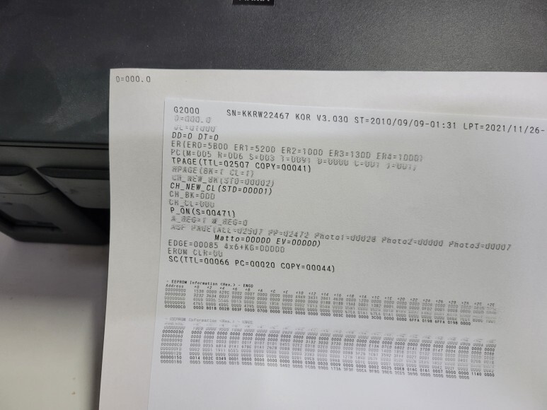 5B00 에러 문제 해결 후 2장의 페이지가 출력되어 나왔습니다. 전원 및 경고등이 번갈아가면 점멸, 5B00 에러 메세지가 컴퓨터에서 알림창으로 나오고 작동이 불가하여 프린터 서비스 모드로 진입하고 캐논 서비스툴로 우선 폐잉크 패드 리셋, 0% 초기화 처리했습니다.