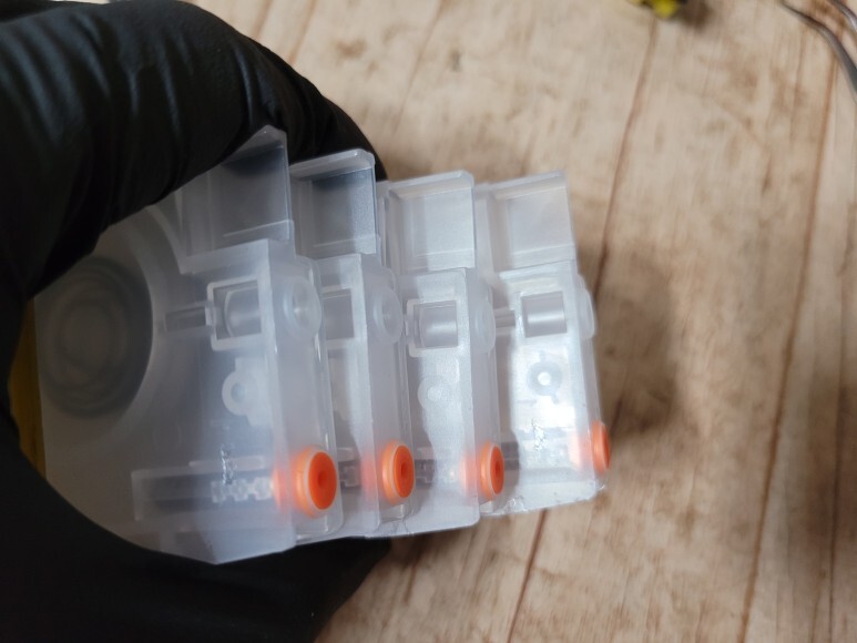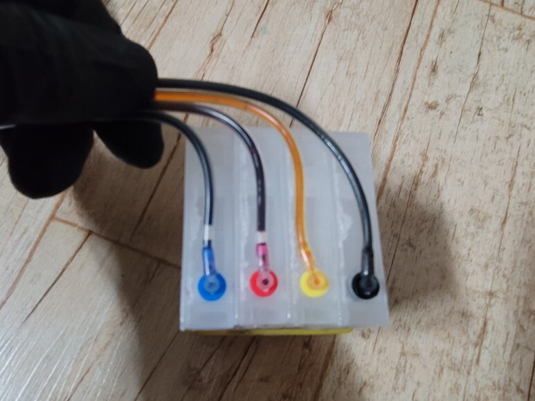 칪없이 구동하기 위해 칩을 모두 폐기하고 No Chip용 카트리지로 교체하고 잉크 석션하여 호스 및 카트리지 내부에 잉크를 가득 채웠습니다.