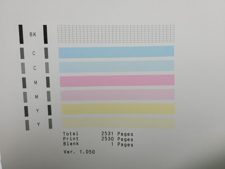프린터 노즐 점검 페이지를 확인하여 정상적인 출력 상태를 확인했습니다. 다행히 헤드 카트리지 교체를 하지 않아도 되었습니다.