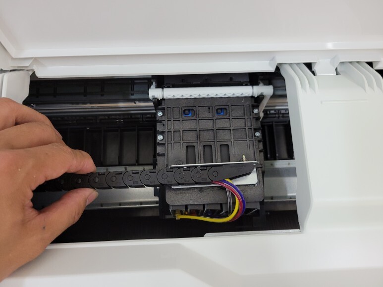HP T525 24인치 플로터에 미디어 롤을 장착하고 전원을 연결하여 헤드를 이동, 무한잉크 장착 준비를 했습니다.