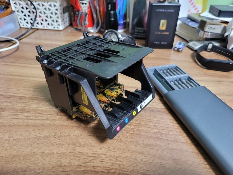 한 번 더, T10 드라이버로 950헤드 PCB 쪽 나사 2개를 풀면 슈팅에어라인, 칩판부 부품이 분리됩니다. 이렇게 되면 확실하게 오염된 헤드를 볼 수 있습니다.