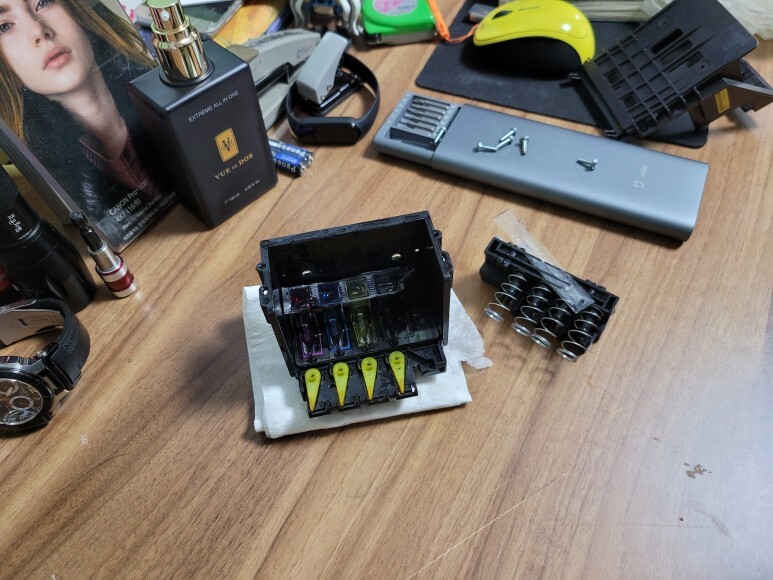 칩판부도 나사 2개를 분리하여 숨어 있는 잉크 찌꺼기 및 물기를 털어내고 말렸습니다. (이 부분은 미숙련자는 안 하는 게 헤드 손상 방지에 좋습니다.)