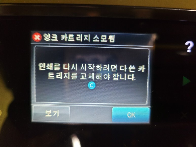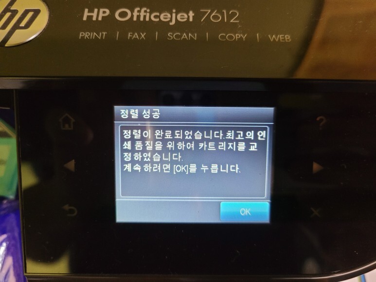잉크 카트리지 소모됨 문제로 HP 7612 팩스복합기가 작동불, 멈춰 있었습니다.