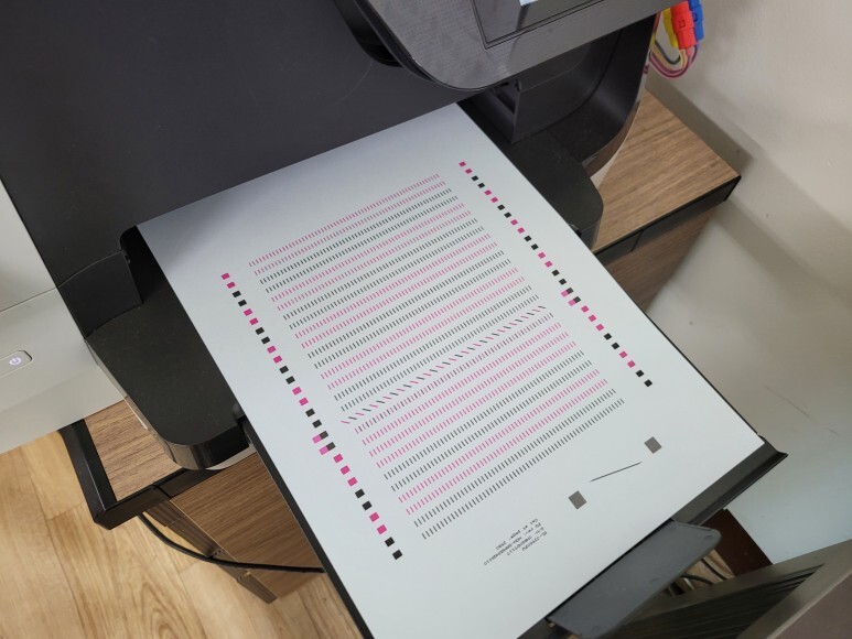 헤드 노즐 점검을 위해 인쇄 품질 진단 페이지를 출력했습니다. 마젠타 노즐 상태는 좋지는 않았습니다.