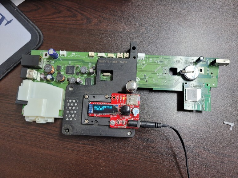 No Chip 무한잉크를 위해 좌측 커버를 열고 메인보드를 빼서 No CHip 펌 지그에 물렸습니다.