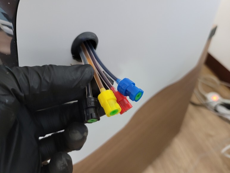 No Chip용 금형카트리지를 장착하고 하우징을 천공하여 잉크 퀵차단밸브가 장착된 공급선, 호스를 밖으로 빼냈습니다.