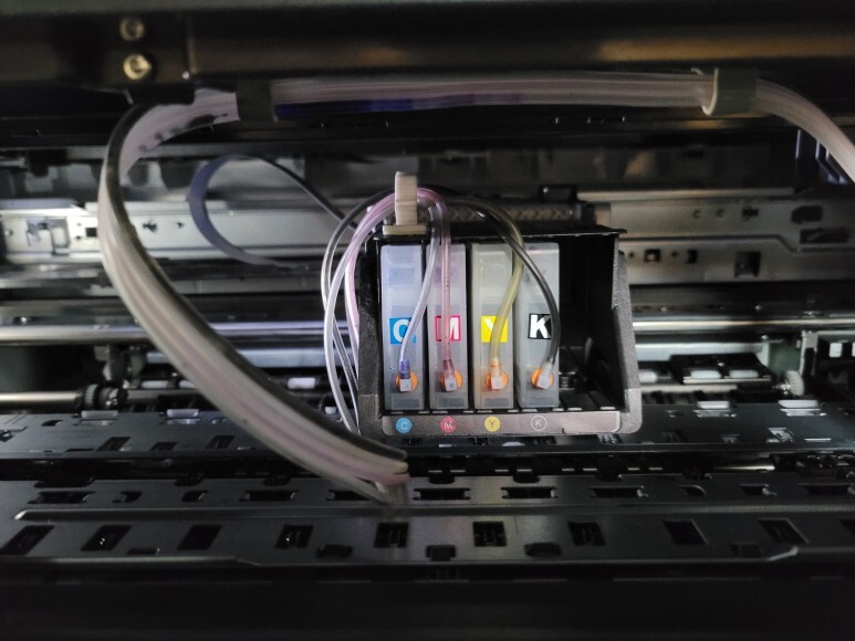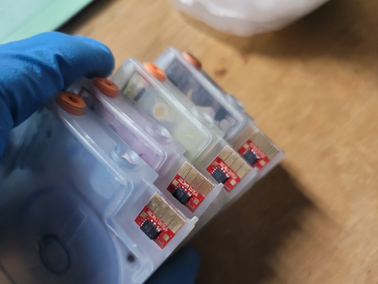 소모품 시스템 문제가 생겼고, 호스에 잉크가 빠지고 경화되어 굳어 있고, 유한 4칩이 부착되어 있었습니다. 잦은 카트리지 제거 등으로 공급선, 호스도 많이 훼손되어 있었습니다.