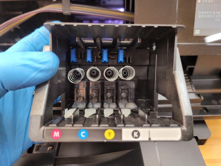 새헤드로 교체했습니다. 카트리지 잉크 석션하여 헤드에 재장착했습니다. 새헤드 교체 후에 SETUP 카트리지 사용이란 메세지가 나오므로 카트리지 초기화가 필요했습니다.