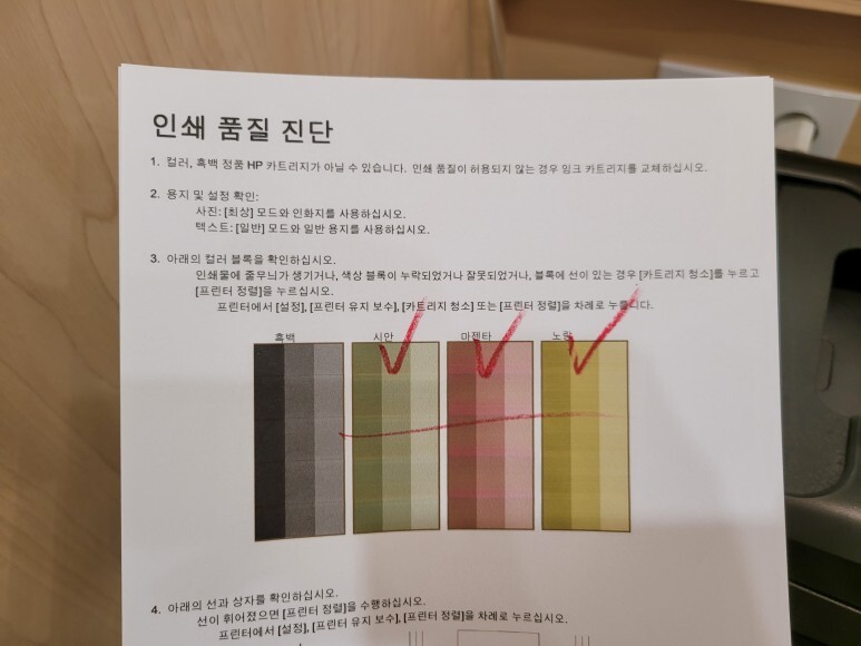 인쇄 품질 진단 페이지를 출력하여 정상적인 출력을 확인 했습니다.