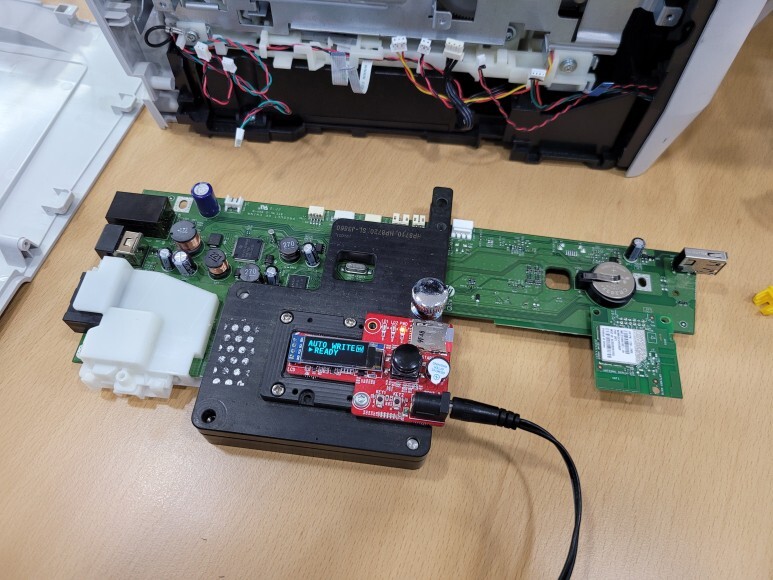좌측 커버를 열어 메인보드를 때어 No Chip펌 지그에 물려 No Chip펌 라이팅을 진행했습니다.