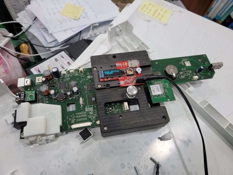왼쪽 커버를 개방하여 메인보드를 때어냈습니다. Chipless Solution (No Chip) 지그에 물렸습니다.