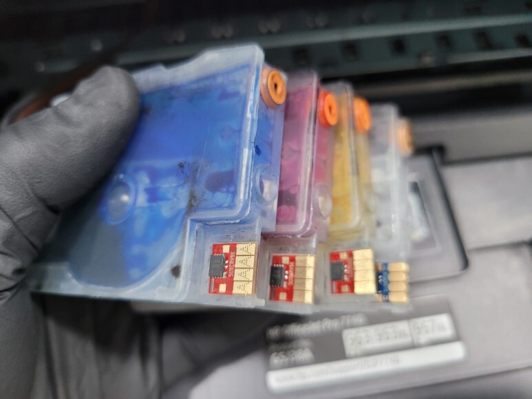 위와 같은 메세지는 8710 무한잉크를 온라인으로 구매하신 분들에서 많이 나타납니다. 카트리지를 빼보면 중국산 4칩으로 되어 있습니다. 온라인 판매제품은 낮은 가격으로 노출하기 위해 저렴한 시스템을 사용한 경우 자주 나타납니다. 카트리지 소모됨으로 초기화 작업을 하면 사용량이 별로 없어도 잦은 펌핑으로 스테이션에 잉크가 넘쳐 흐르기도 합니다. 자동 펌업데이트로 칩을 새로 교체해야 하는 경우도 자주 발생합니다.