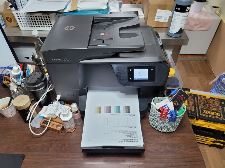 파주 조리읍 소재의 주방 도구 그릇 도매 유통 업체로 사무실에서 사용하는 HP 8710 칩없이 구동하는 기업형 No Chip 무한잉크 팩스복합기였습니다. 잉크 공급시를 놓쳐 또는 공급기를 책상 밑으로 떨궈 잉크가 쏟아지고 공급기 내부에 잉크가 모두 소진되어 출장 수리 요청하여 스케줄 잡아 이동했습니다.