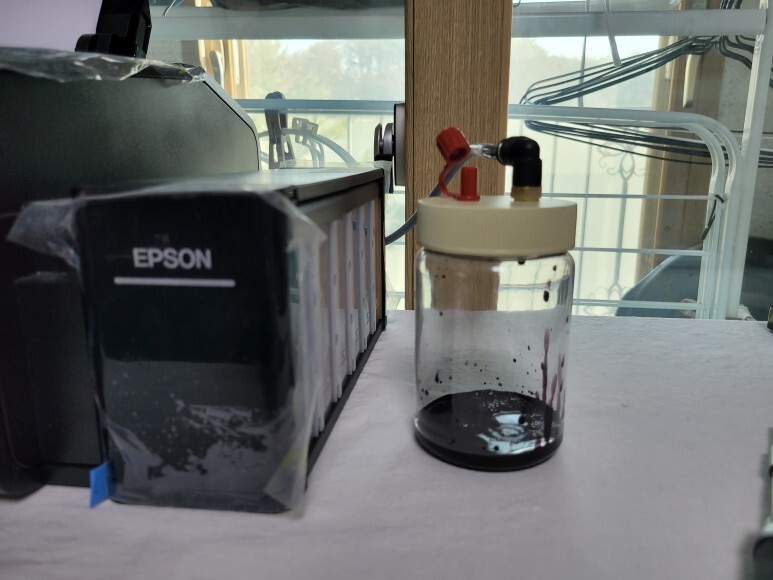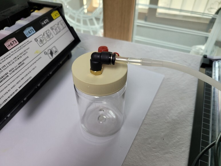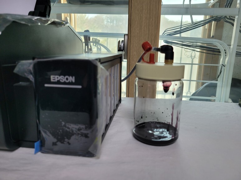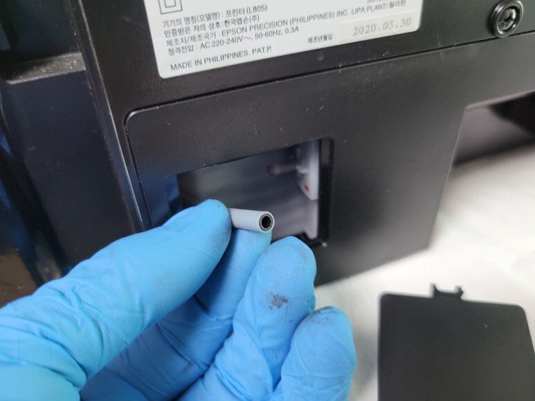 잉크 차징을 위해 많은 잉크가 프린터 내부로 흐리기 때문에 무한잉크는 프린터 후면의 폐잉크통으로 연결되는 호스를 뽑아 외부에 폐잉크통을 장착해야 합니다. 폐잉크가 차면 수시로 확인하여 비워주는 작업을 해야 합니다.