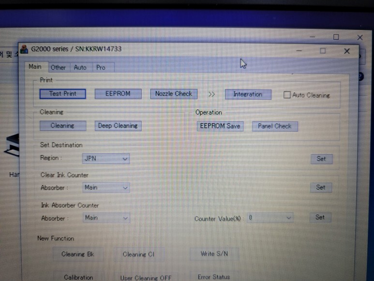 캐논 CANON G2000시리즈 G2900 정품무한 복합기를 USB 연결된 PC에서 Adj 프로그램을 실행하여 Ink Absorber Counter 리셋 처리했습니다. Clea Ink Counter 도 같이 처리했습니다.