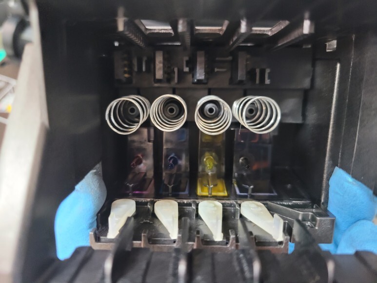 노랑색 호스에 잉크가 빠져 공급이 안되고 있었습니다. 석션하여 호스 및 카트리지 내부에 잉크를 가득 채웠습니다.