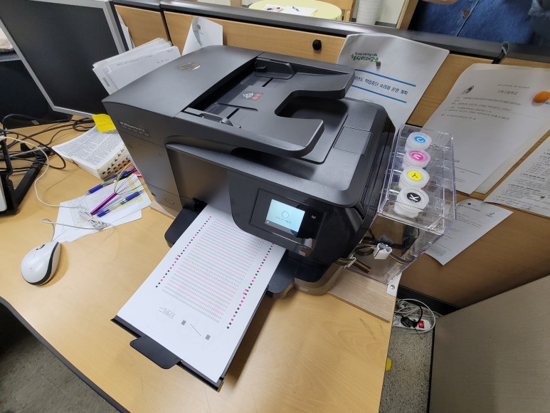 서울 송파구 가락동에 위치한 고등학교 상담실에서 사용하는 HP 8710 무한잉크 팩스복합기로 잦은 카트리지 문제 및 소모품 시스템 문제 등으로 멈춰 버려 유한 4칩 HP 8710 무한잉크 장비를 임대형 및 기업형, B2B용 (보험사, 군부대, 학교, 학원, 부동산, 핸드폰매장, 교육사 등등)으로 사용되는 칩없이 구동하는 기업형 Chipless Solution (No Chip) 무한잉크 장비로 전환 출장수리 요청으로 스케줄 맞춰 방문하여 수리 완료 했습니다.