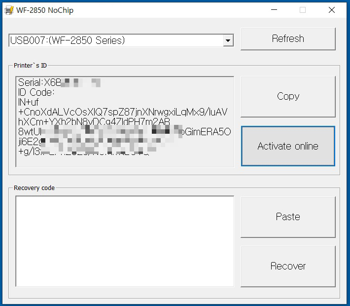 인증키 프로그램을 실행하여 Acrivate Online 버튼을 눌러 구매한 인증키를 입력하여 OK 누르고 엡손 WF-2850 팩스복합기를 재부팅하면 칩없이 구동하는 무한잉크 장비가 완료됩니다. 프린터 ID 코드는 복사해서 잘 보관해둬야 추후 복구시에 반드시 필요합니다. 분실시에는 인증키를 유료 재발급 받아야 합니다.