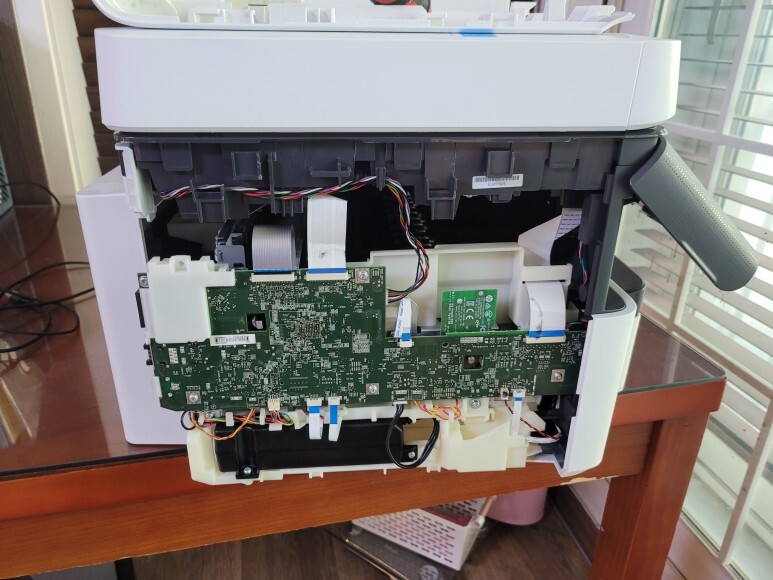 HP 7720 메인보드를 No Chip 펌 Write, OK 완료했습니다. 1회성 인증칩도 붙였다 폐기처리했습니다. 메인보드를 재장착하고 프린터 전원을 켠 후에 초기화 진행했습니다.
