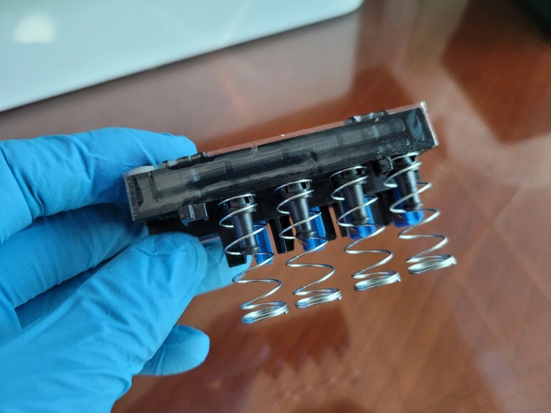 헤드를 분리해 그간 유한 4칩 사용으로 펌핑이 잦아 비닐이 탈락되어 탄성접착제로 붙여 수리 했습니다. 헤드 챔버에 탄성 접착제를 바르고 테이핑하여 보강했습니다. 지그로 눌러 세정액을 주입해서 세척했습니다.