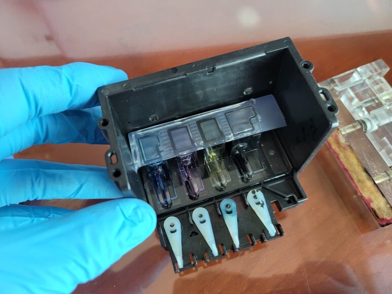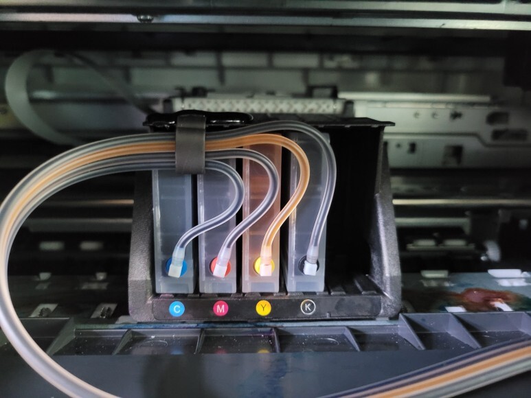 호스를 잘라 잉크 퀵차단밸브를 장착하여 언제든지 분리 이동할 수 있게 하였습니다. 유한 4칩을 모두 제거했습니다. No Chip 용 카트리지 새로 교체했습니다. 석션하여 호스 및 카트리지에 잉크를 가득 채우고 헤드에 장착한 후에 메탈크램프와 핫멜트 보강하여 단단단히 고정 정리하였습니다.