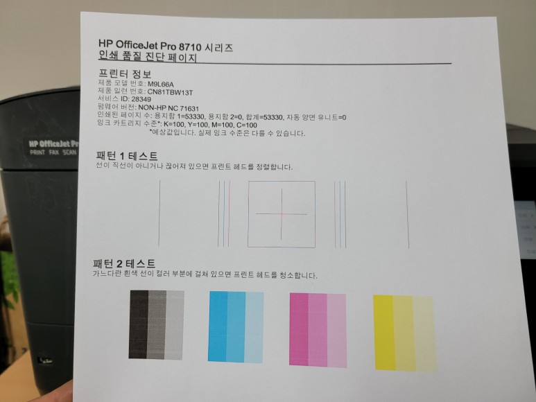 전원을 연결하여 초기화 완료 후에 정상적 헤드 정렬 페이지가 출력되고 Chipless Solution(No Chip) 인증을 위해 초기 부착한 인증칩을 제거했습니다.