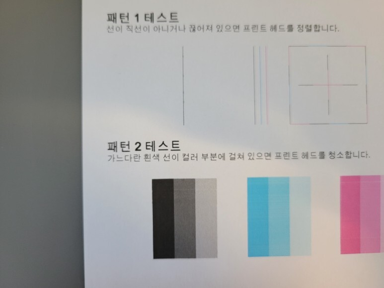 인쇄 품질 진단 페이지를 출력하여 헤드 노즐 상태를 점검하였습니다. 블랙 색상이 끊어지고, 뭉개지는 현상없이 정상적으로 출력되어 나왔습니다.