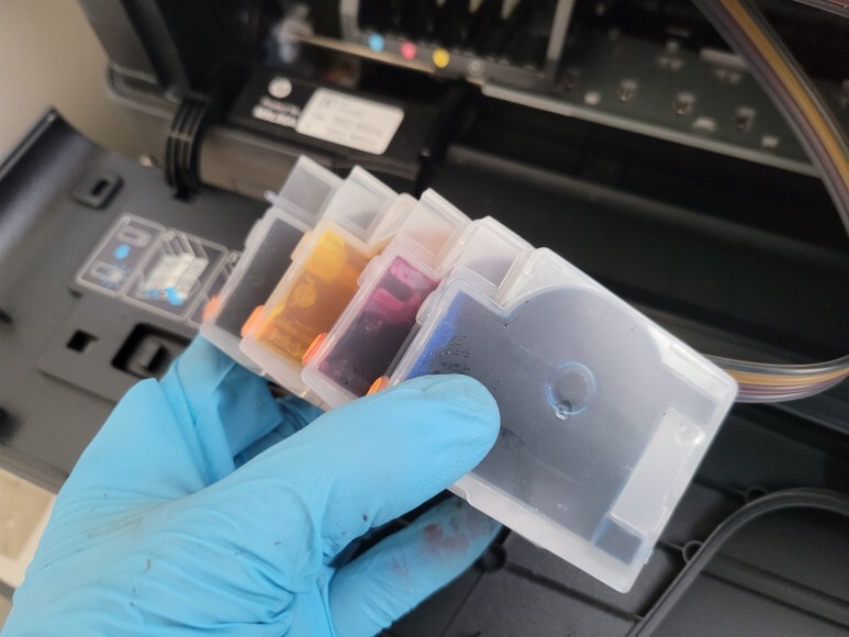 석션하여 카트리지 내부에 잉크를 가득 채웠습니다.