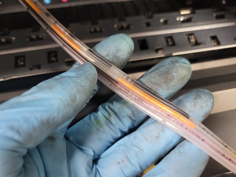 잉크 공급선, 호스 내부에 잉크가 빠지고 심하게 경화되어 막혀 전혀 잉크가 공급되지 못하고 있었습니다.