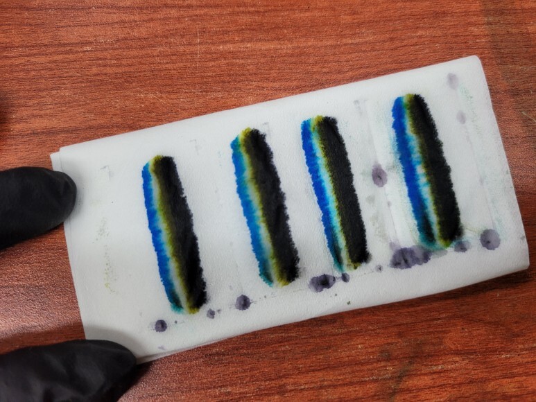 마른 휴지에 노즐을 찍어 확인 : 노즐이 막혀 세정액이 나오지 않는 마른 공간에 타 색상 침범하여 오염시켰습니다. 세정액 진행할수록 세정액이 노즐을 통해 나와 타 색상이 침범하지 못했습니다.