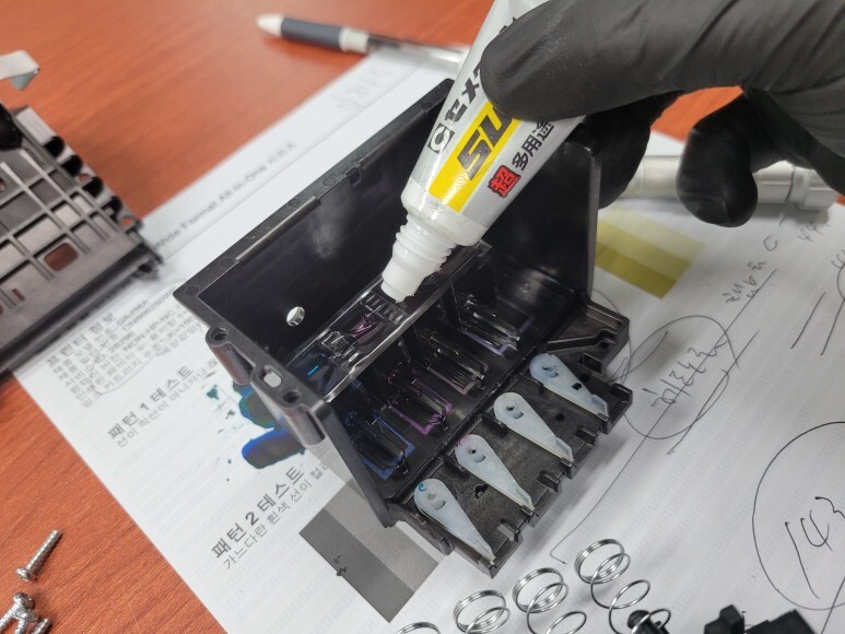테이핑 보강하여 챔버보호 지그로 눌러 양생시킨 후에 세정액을 주입하여 헤드 내부 및 노즐 세척을 진행했습니다.