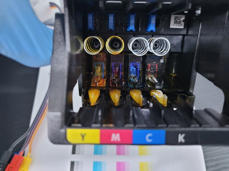 HP T125 헤드 챔버가 터져 내부가 잉크로 심하게 오염되어 있었습니다. Y 색상 챔버터짐 (뇌출혈)