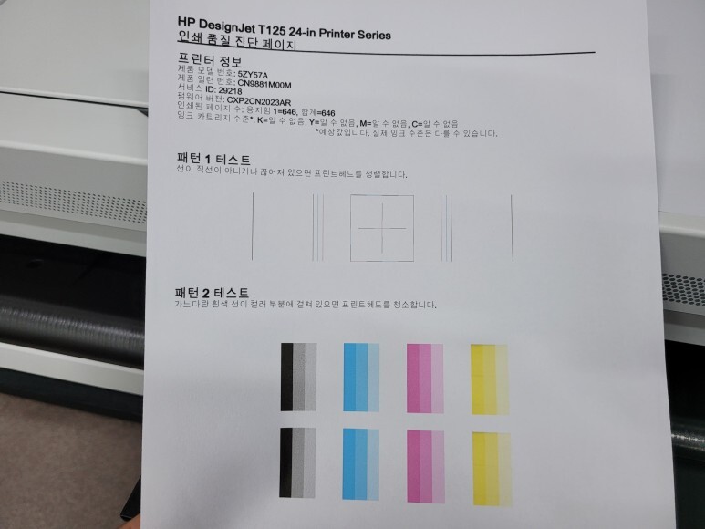 헤드 노즐 점검을 위해 진단페이지를 출력해 확인했습니다.