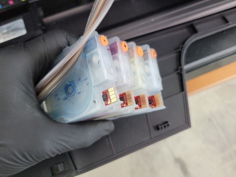 석션하여 호스 및 카트리지에 잉크를 가즉 채우고 초기 No Chip 인증칩 부착 후 헤드에 재장착했습니다.